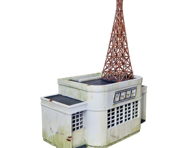 A small art deco style radio station, complete with collapsing brickwork and a rusty old tower. This building is available either unbranded for you to add your own signage, or with MRRP branding, for fans of the Model Rail Replacement Podcast.